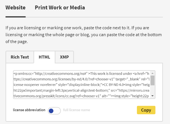 Example of “machine readable” code from Creative Commons License Chooser. CC BY 4.0